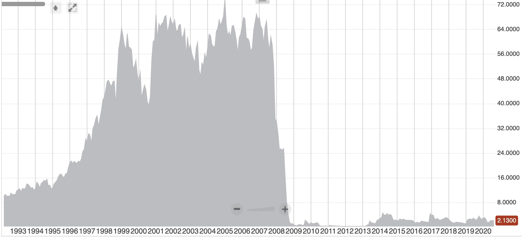 Bei Freddie Mac sieht es auf Grund des identischen Geschäftsmodells nicht anders aus, als bei Fannie Mae. Einem Kurs von rund 58 Dollar vor der Krise steht ein aktueller Kurs von knapp über 2 US-Dollar gegenüber. Anleger verloren hier innerhalb weniger Wochen rund 96 % ihres Kapitals. Der traurige Abschluss einer weltweiten Krise, die sicher nicht die letzte war.