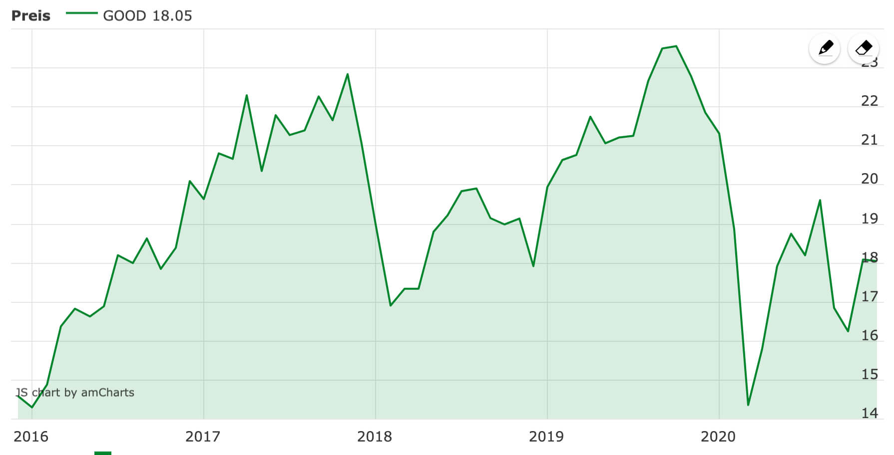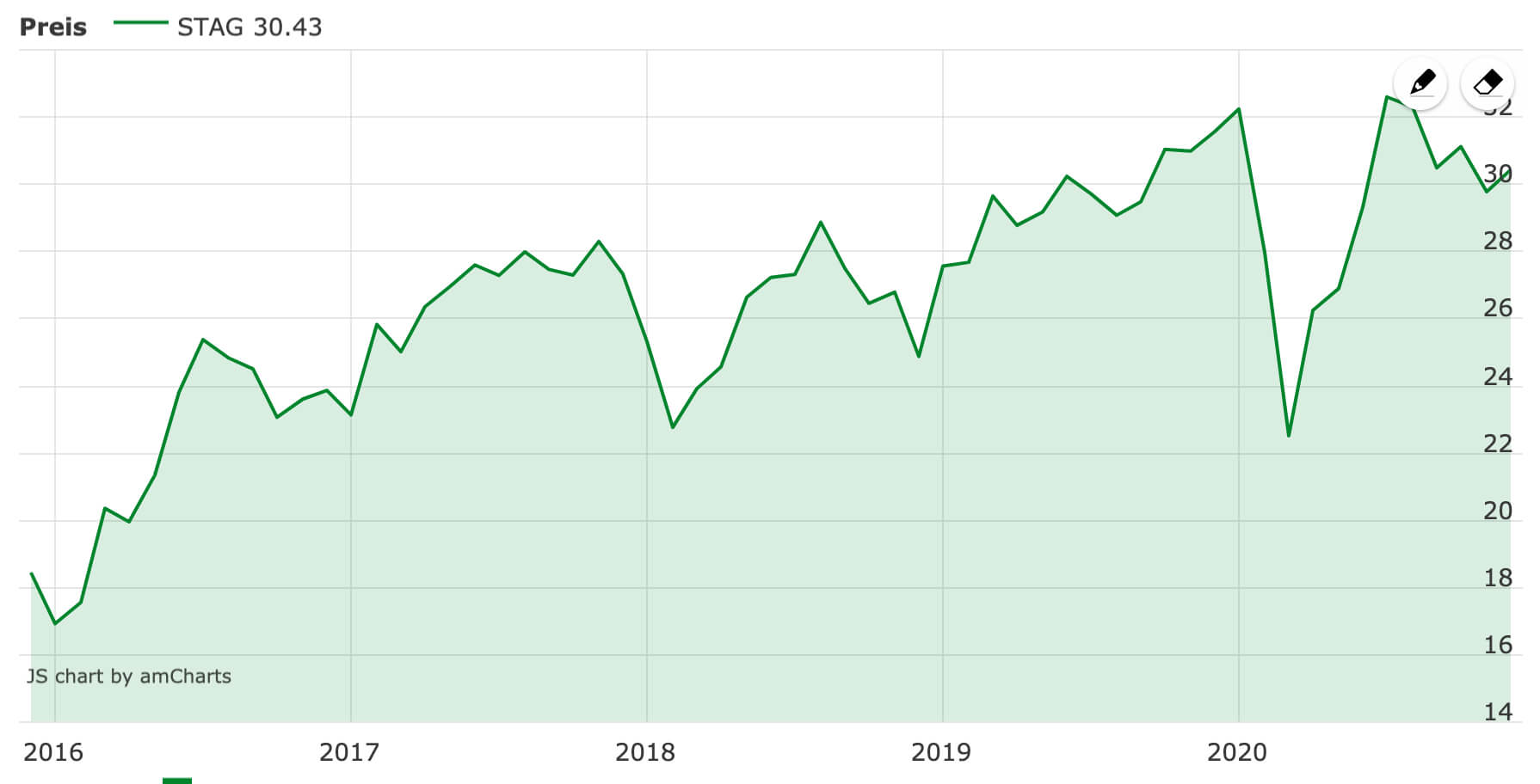 Die Erholung im Jahr 2020 nach März hat Stag Industrial wieder nahe an alte Höchststände katapultiert. Ein erneutes Aufflammen der Covid19-Krise könnte den Kurs jedoch schnell wieder auf Talfahrt schicken. Bei einem KBV von rund 1.9 und einer Dividendenrendite von rund 4,7 % mit monatlicher Ausschüttung ist das Unternehmen immer noch attraktiv für Investoren mit einem langen Anlagehorizont. Dabei sollte man jedoch nicht die konjunkturellen Risiken außer Acht lassen.