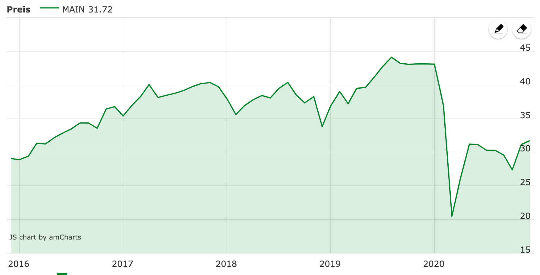Auch Main Street Capital ist ein Unternehmen, das in Kreisen von Dividendenanlegern bestens bekannt sein dürfte. Dabei handelt es sich bei diesem Unternehmen nicht um einen REIT, sondern um eine sogenannte BDC. BDC steht für „Business Development Company“. Main Street Capital ist ein Private Equity Investor, der kleinen und mittleren Unternehmen Eigenkapital und Know-How zur Verfügung stellt, um diese nachhaltig zu großen Unternehmen aufzubauen. Die Corona-Krise hat hier tiefe Spuren hinterlassen.